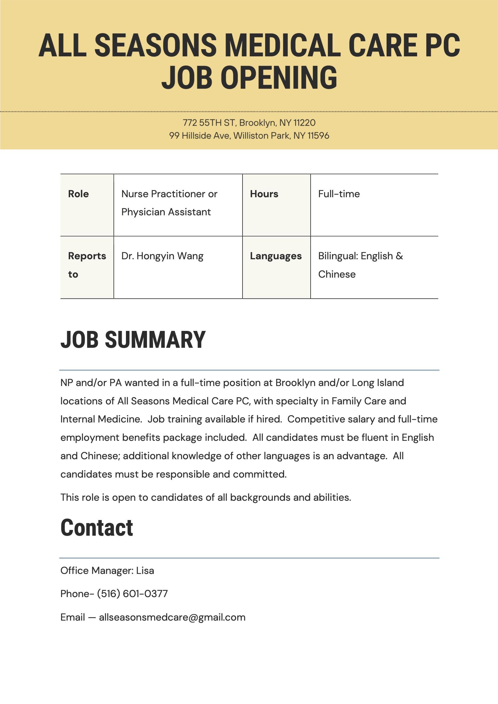 NP and/or PA wanted in a full-time position at Brooklyn and/or Long Island locations of All Seasons Medical Care PC, with specialty in Family Care and Internal Medicine.